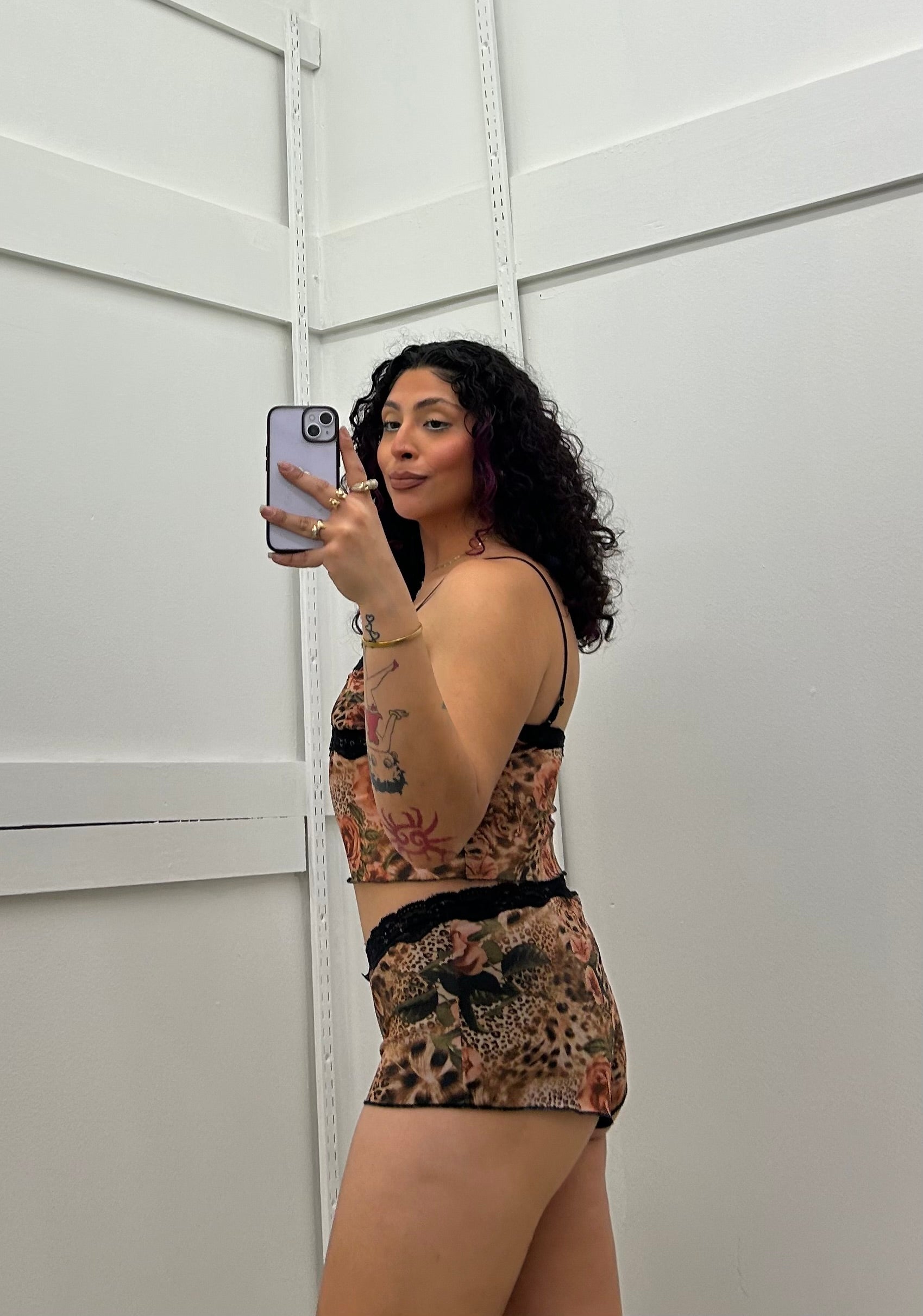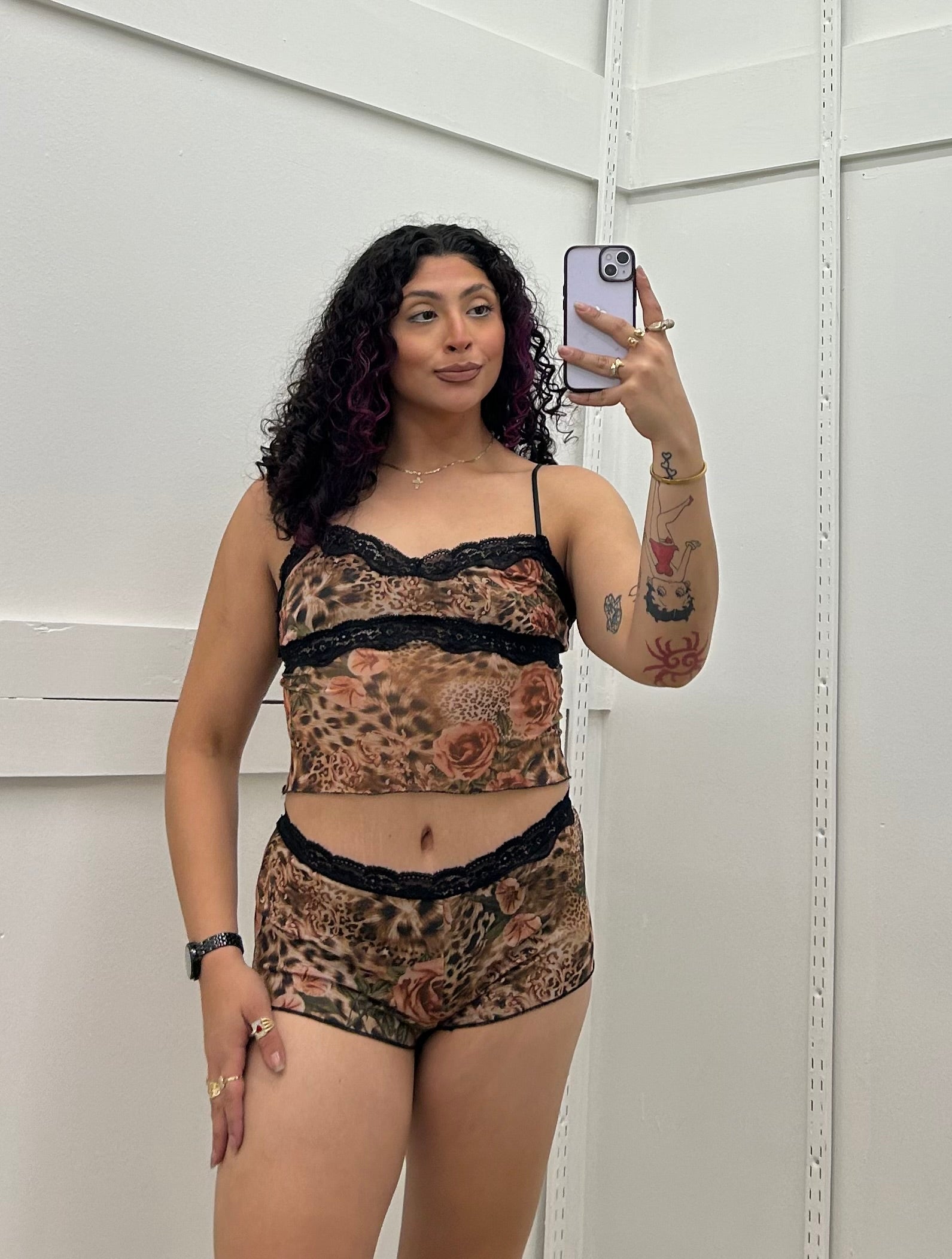 LEOPARD FLORAL LEOPARD LACE TRIM MESH TOP AND SHORTS SET