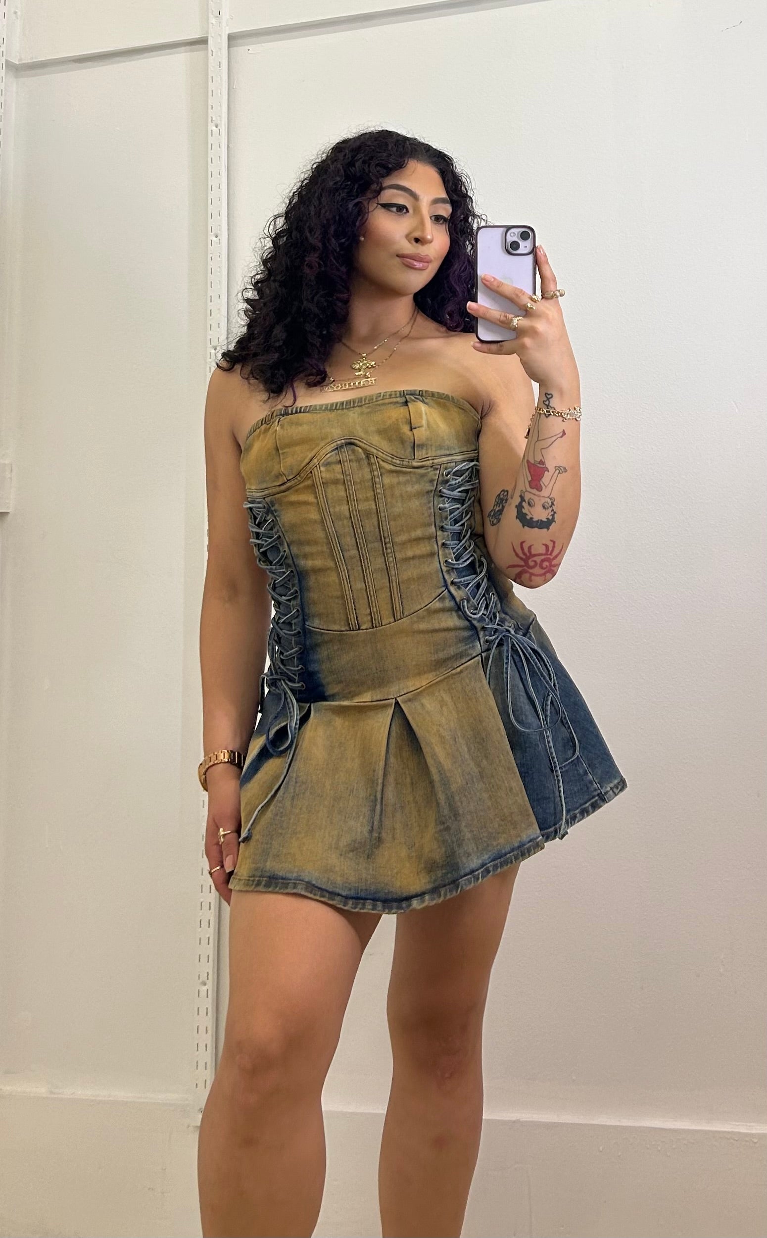 RUSTIC DENIM VINTAGE WASH DENIM LACE UP TUBE AND PLEATED DRESS