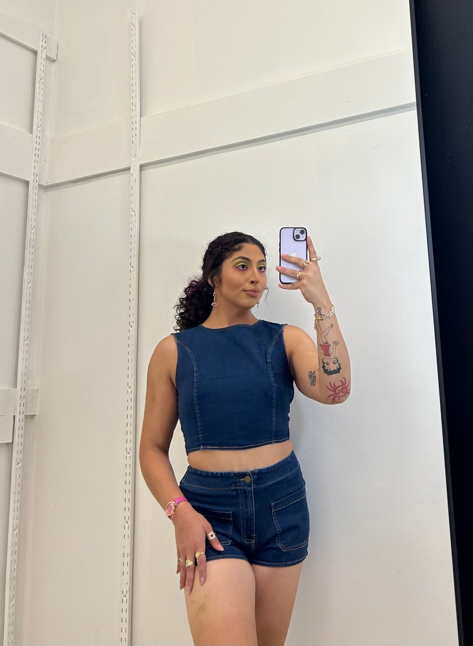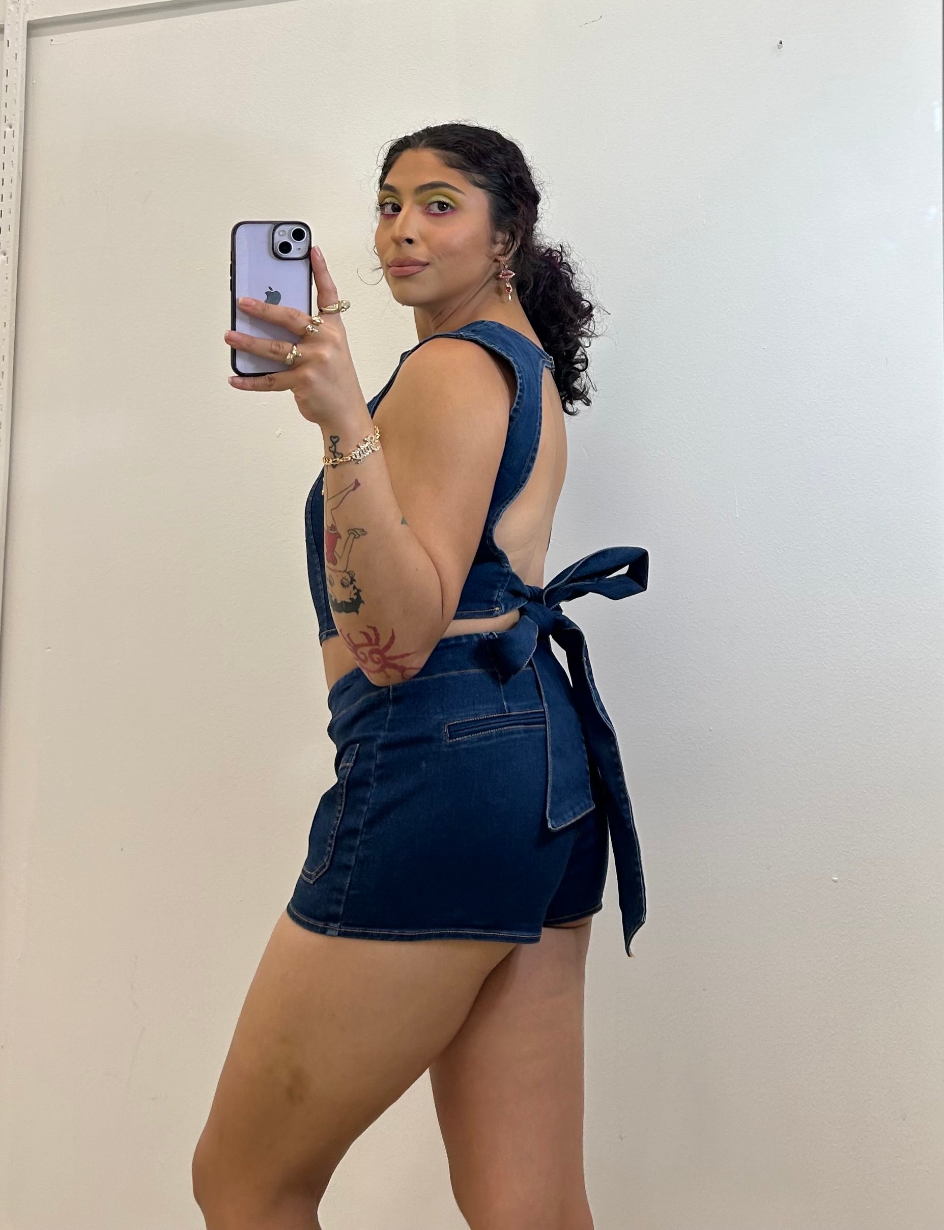 DENIM BACK TIE WITH DENIM SHORTS SET